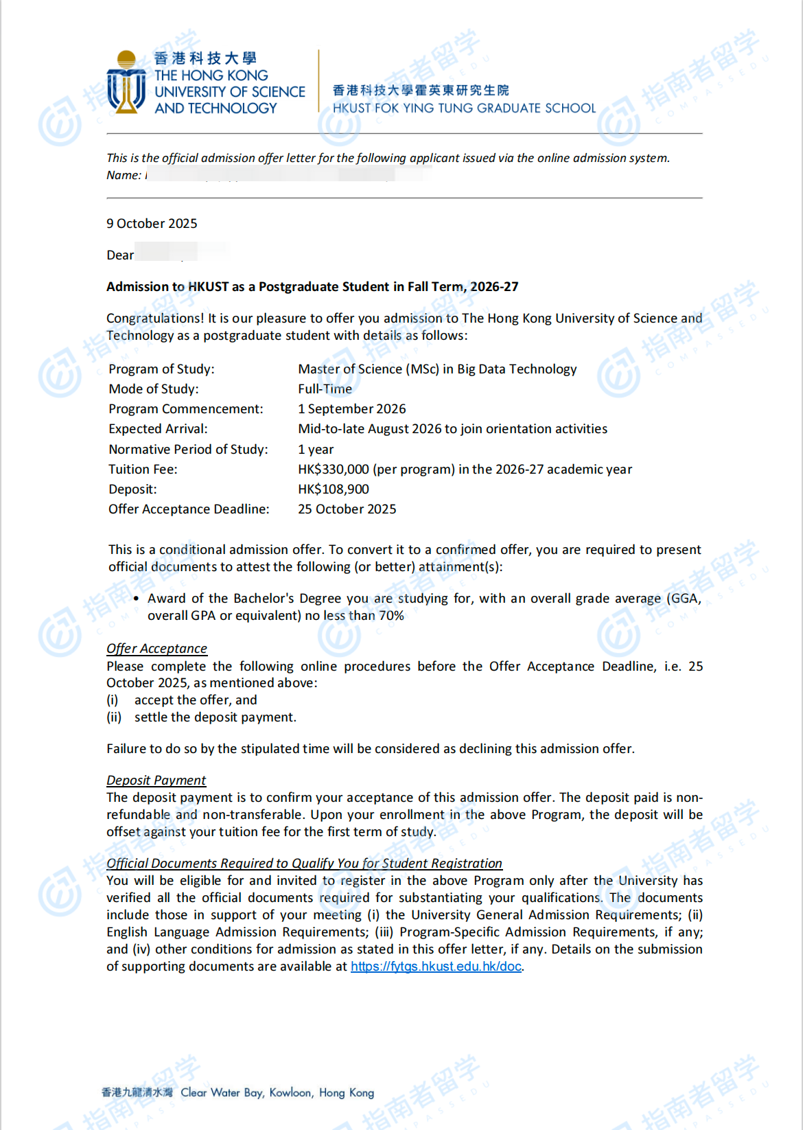 香港科技大学大数据科技理学硕士研究生offer一枚