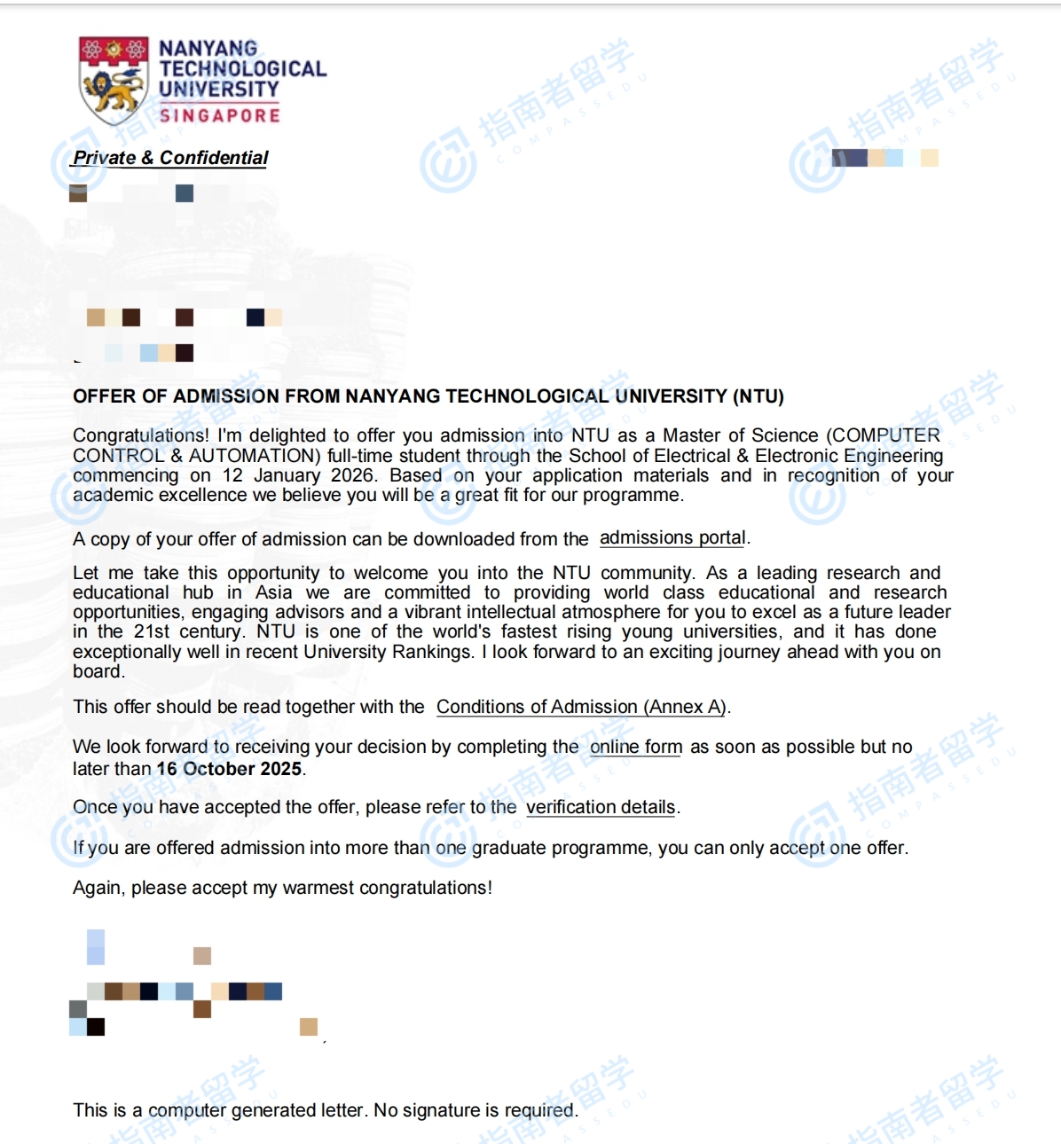 南洋理工大学计算机控制与自动化理学硕士研究生offer一枚