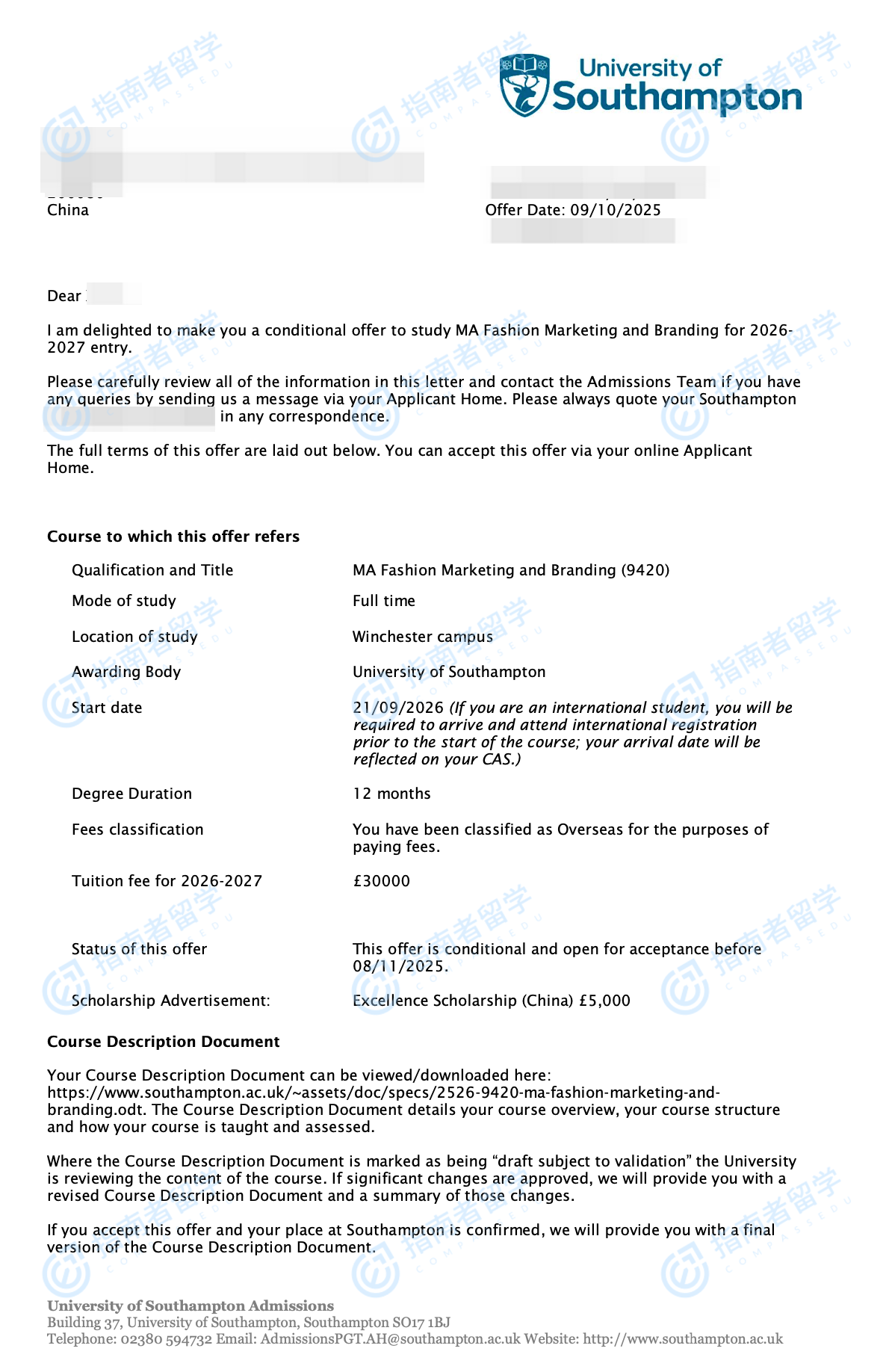 南安普顿大学时尚营销与品牌文学硕士研究生offer一枚