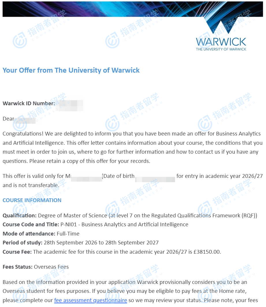 华威大学商业分析&人工智能理学硕士研究生offer一枚