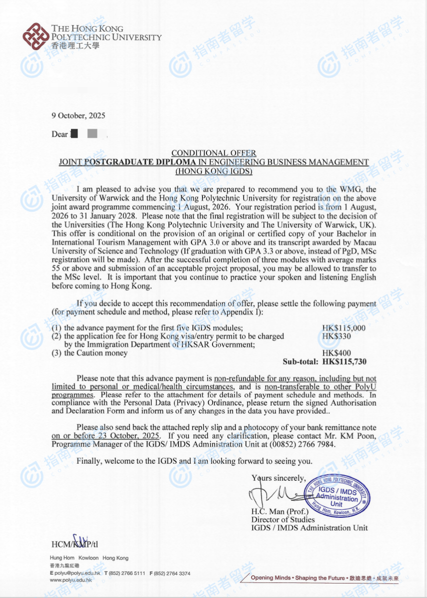 香港理工大学工程商业管理理学硕士研究生offer一枚