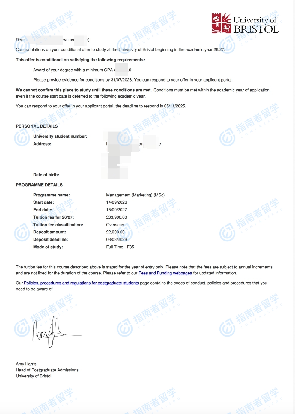 布里斯托大学管理学理学硕士(市场营销 )研究生offer一枚