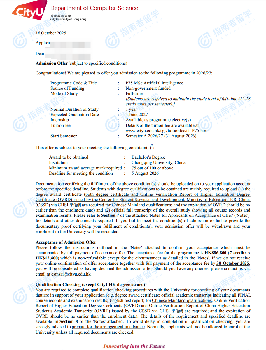 香港城市大学人工智能理学硕士研究生offer一枚