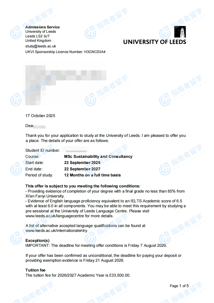 利兹大学可持续发展与咨询理学硕士研究生offer一枚