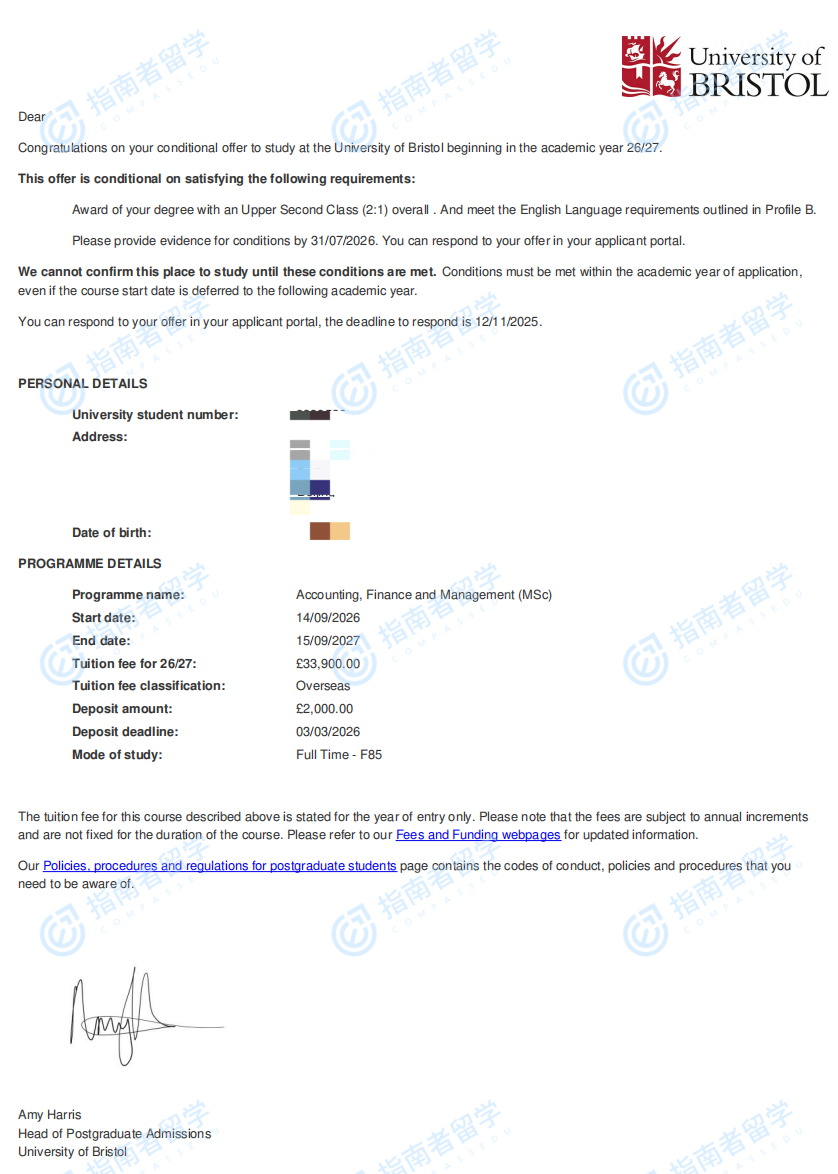 布里斯托大学会计、金融与管理理学硕士研究生offer一枚