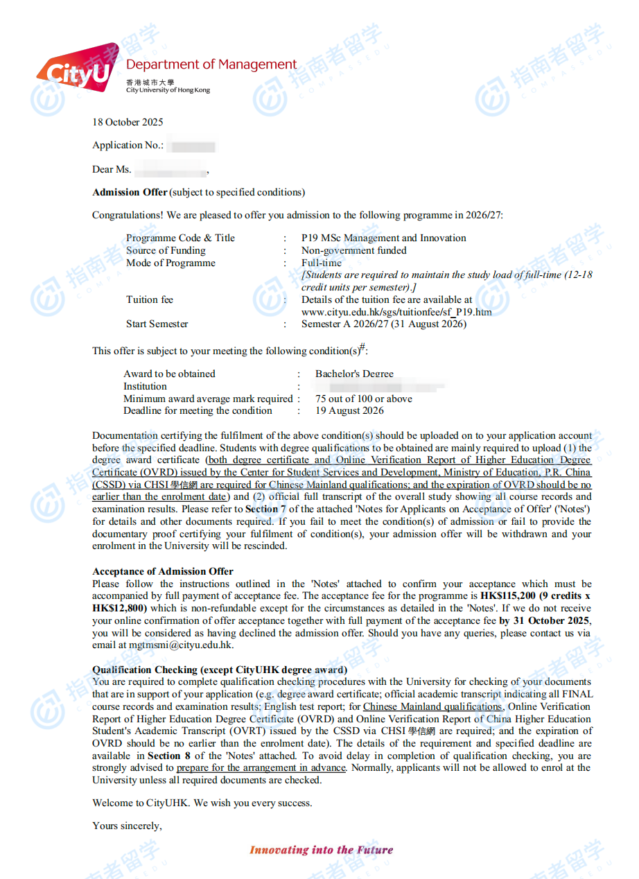 香港城市大学管理与创新理学硕士研究生offer一枚