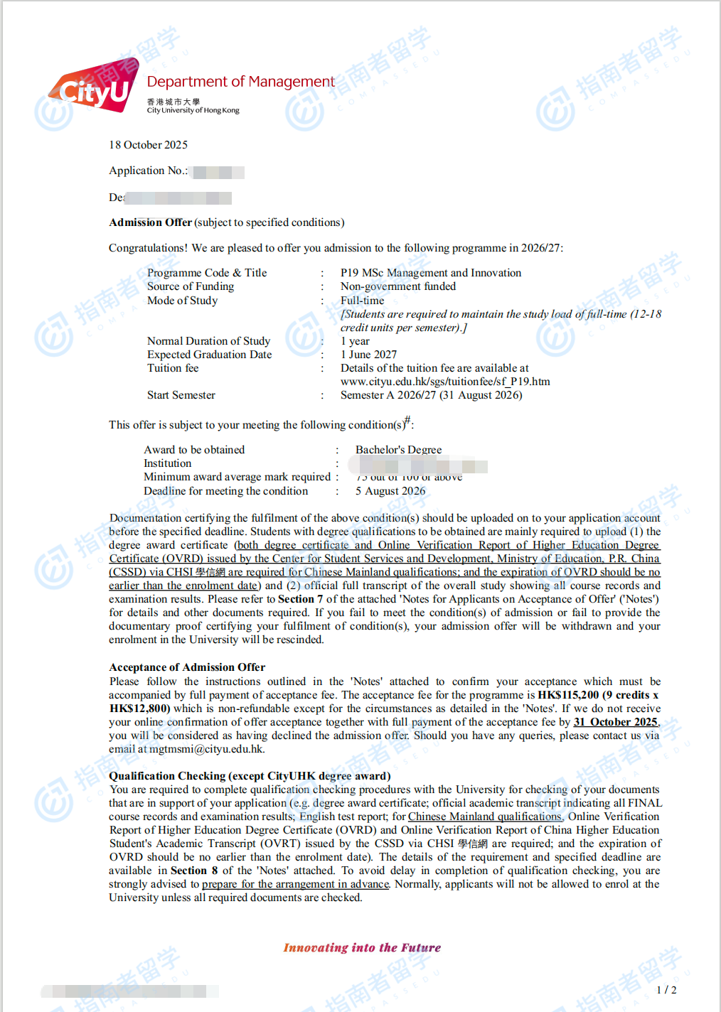 香港城市大学管理与创新理学硕士研究生offer一枚