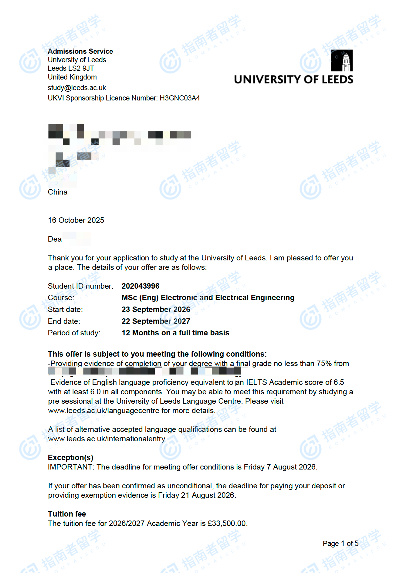 利兹大学电子与电气工程(工程)理学硕士研究生offer一枚