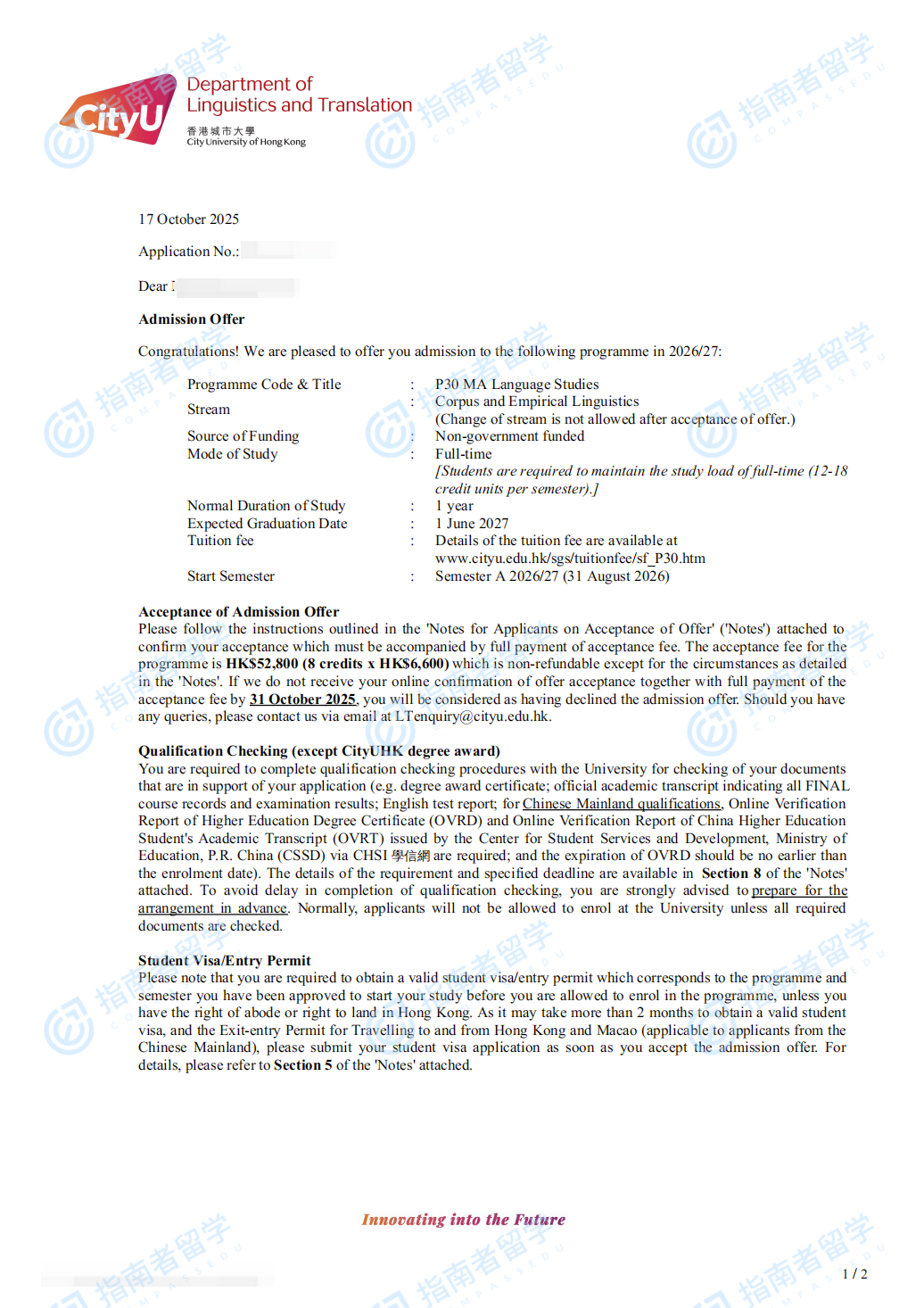 香港城市大学语言研究文学硕士研究生offer一枚