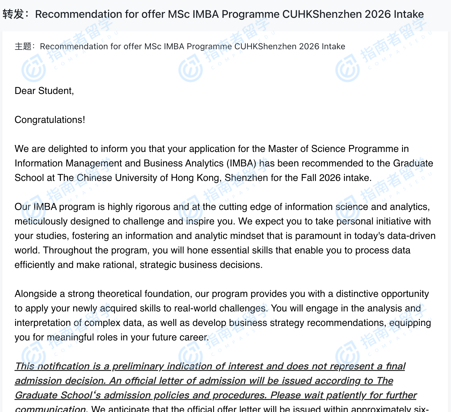 香港中文大学信息管理 & 商业分析理学硕士(CUHK-Shenzhen)研究生offer一枚