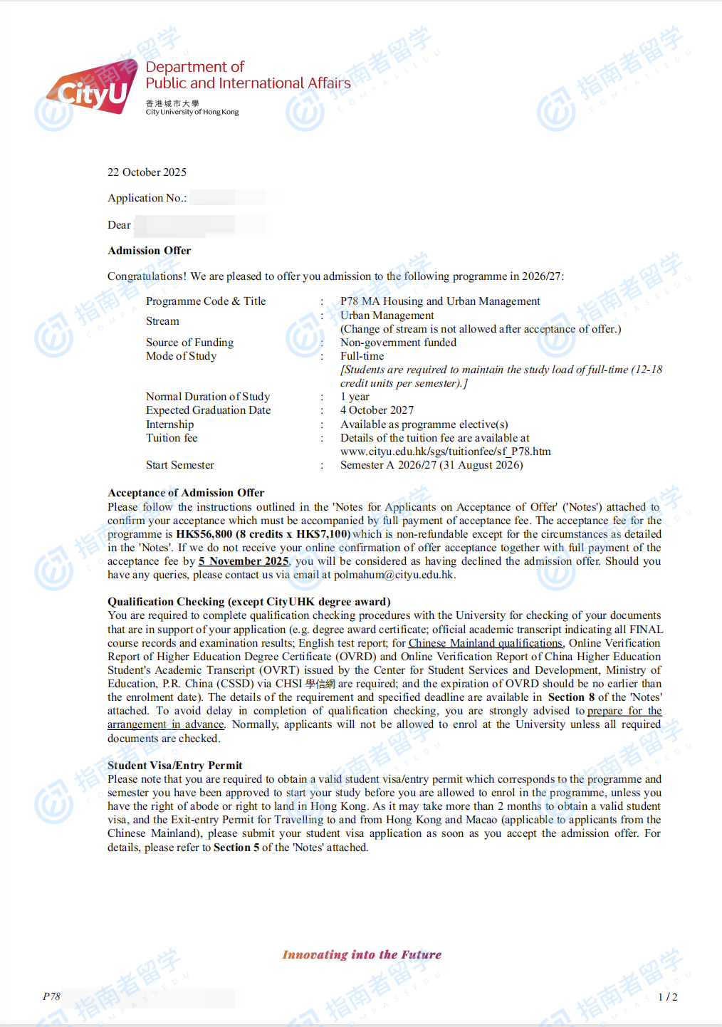 香港城市大学房屋及都市管理文学硕士研究生offer一枚