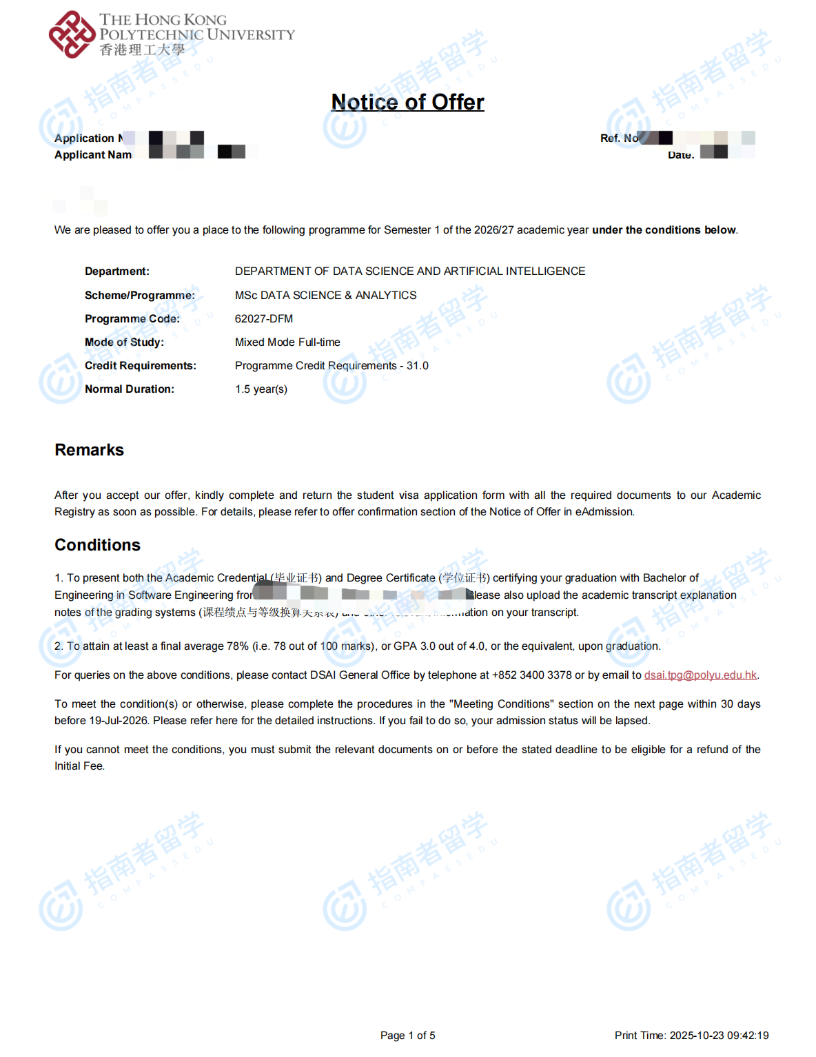 香港理工大学数据科学及分析理学硕士研究生offer一枚