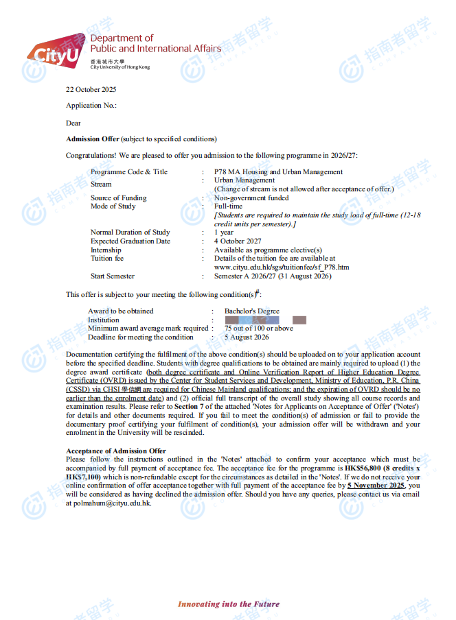 香港城市大学房屋及都市管理文学硕士研究生offer一枚