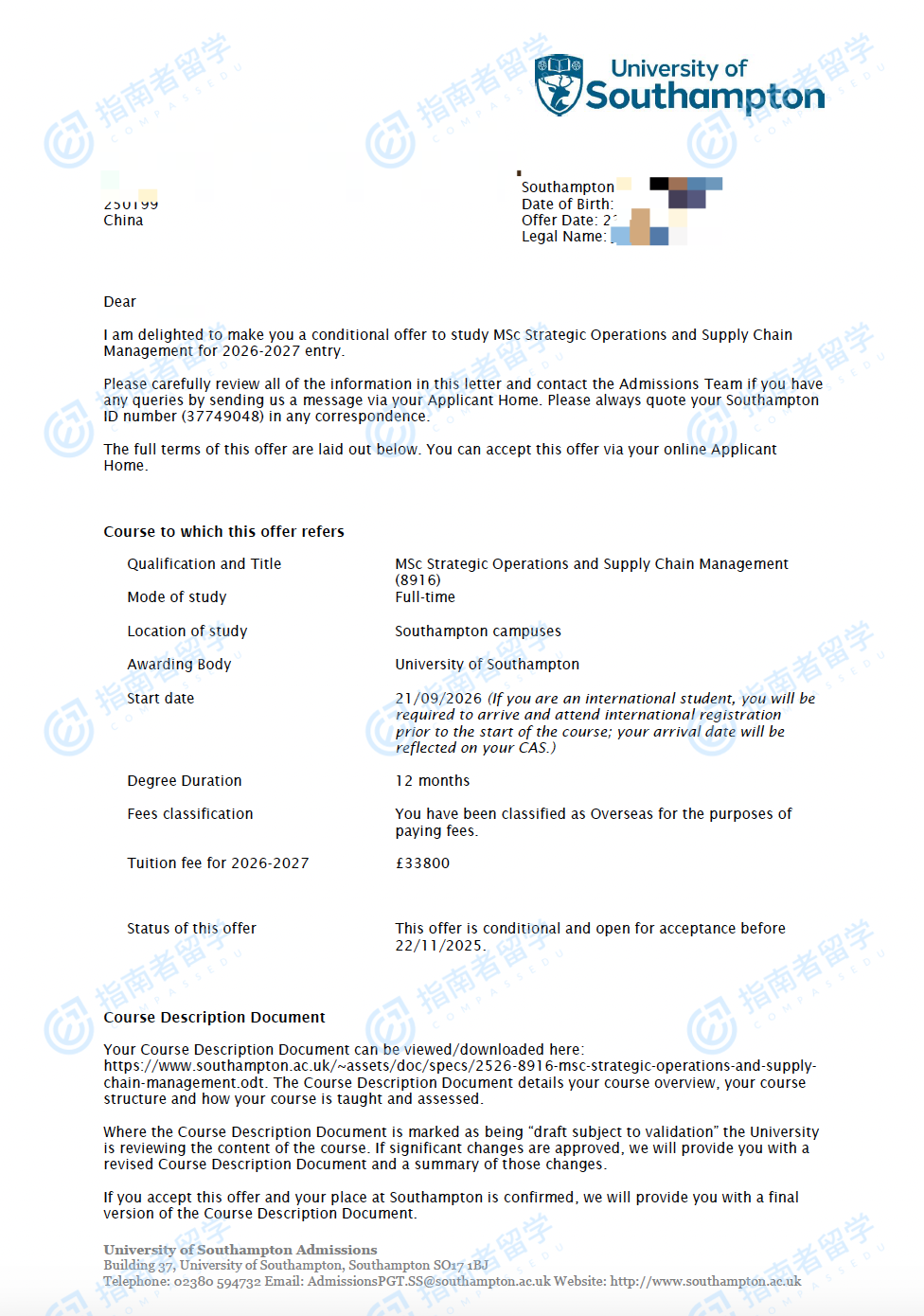 南安普顿大学战略运营与供应链管理理学硕士研究生offer一枚