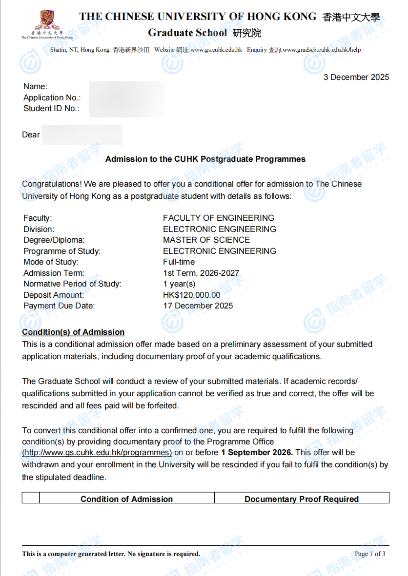 香港中文大学电子工程理学硕士研究生offer一枚