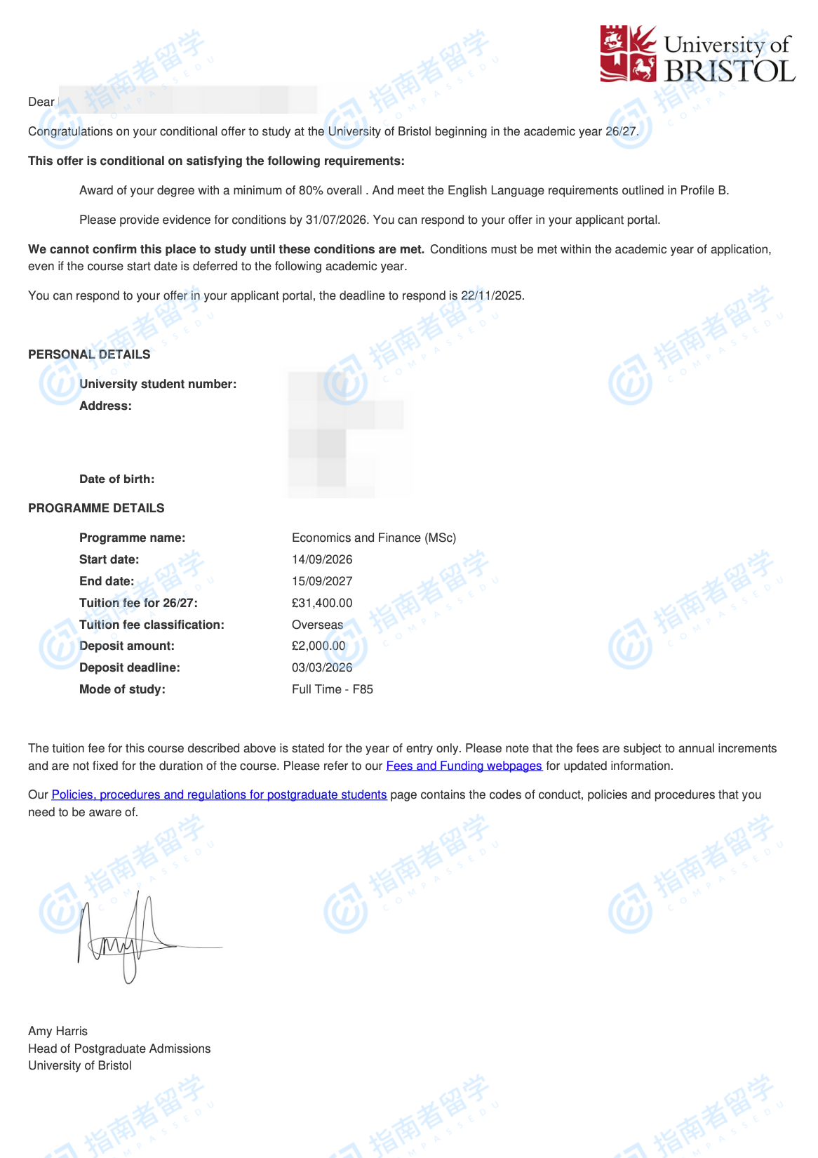 布里斯托大学经济与金融理学硕士研究生offer一枚