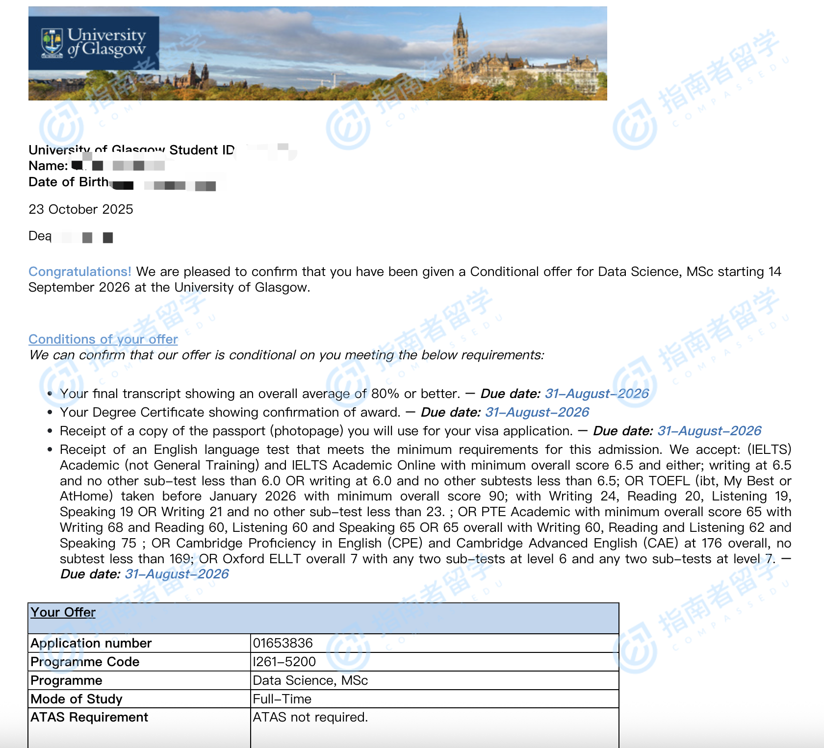 格拉斯哥大学数据科学理学硕士研究生offer一枚