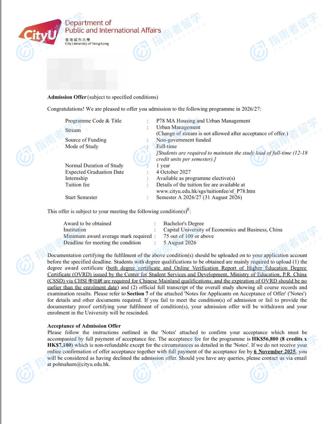 香港城市大学房屋及都市管理文学硕士研究生offer一枚