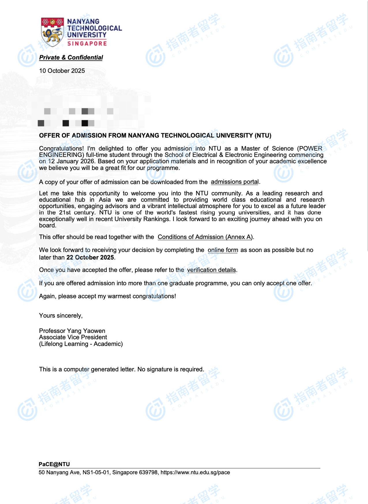 南洋理工大学电力工程理学硕士研究生offer一枚