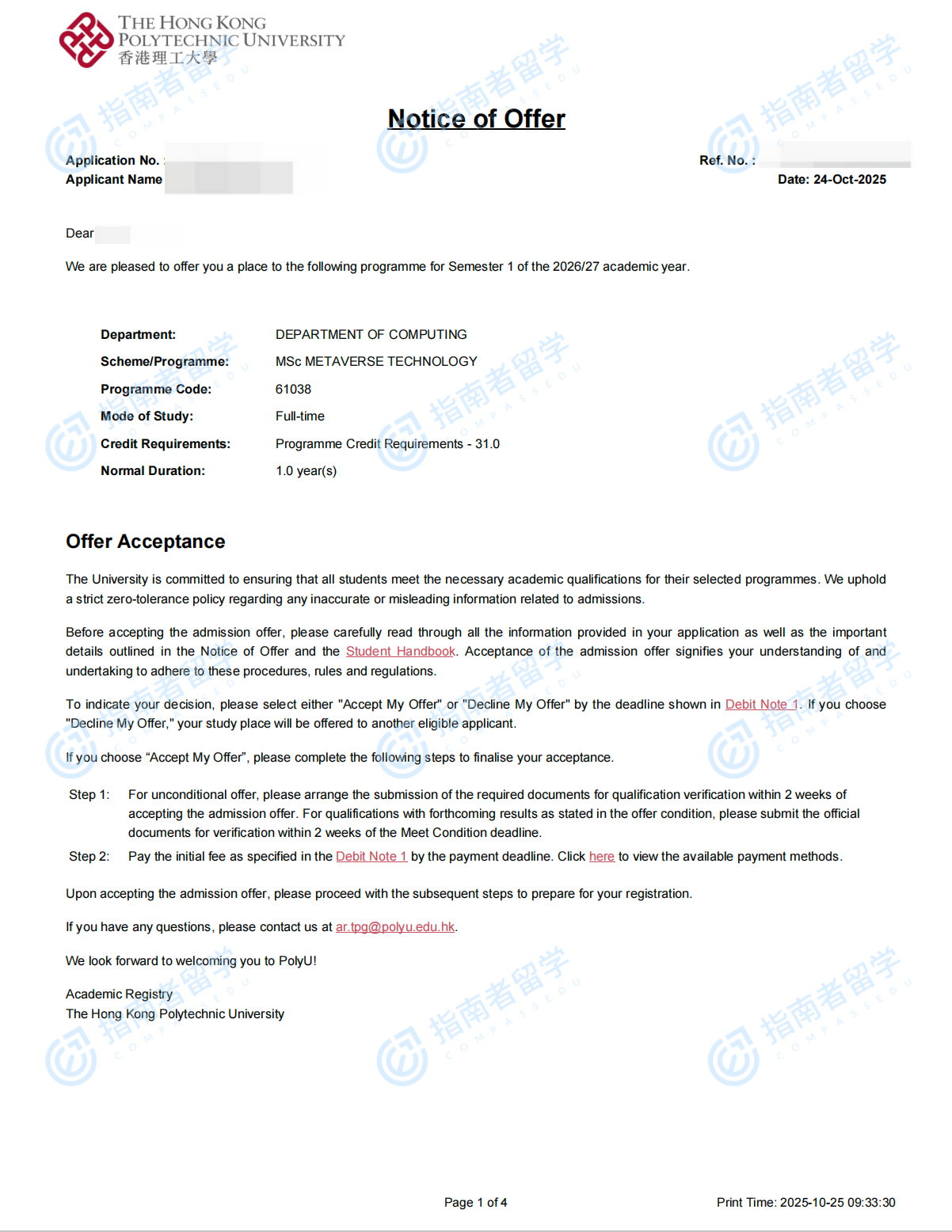 香港理工大学元宇宙科技理学硕士研究生offer一枚