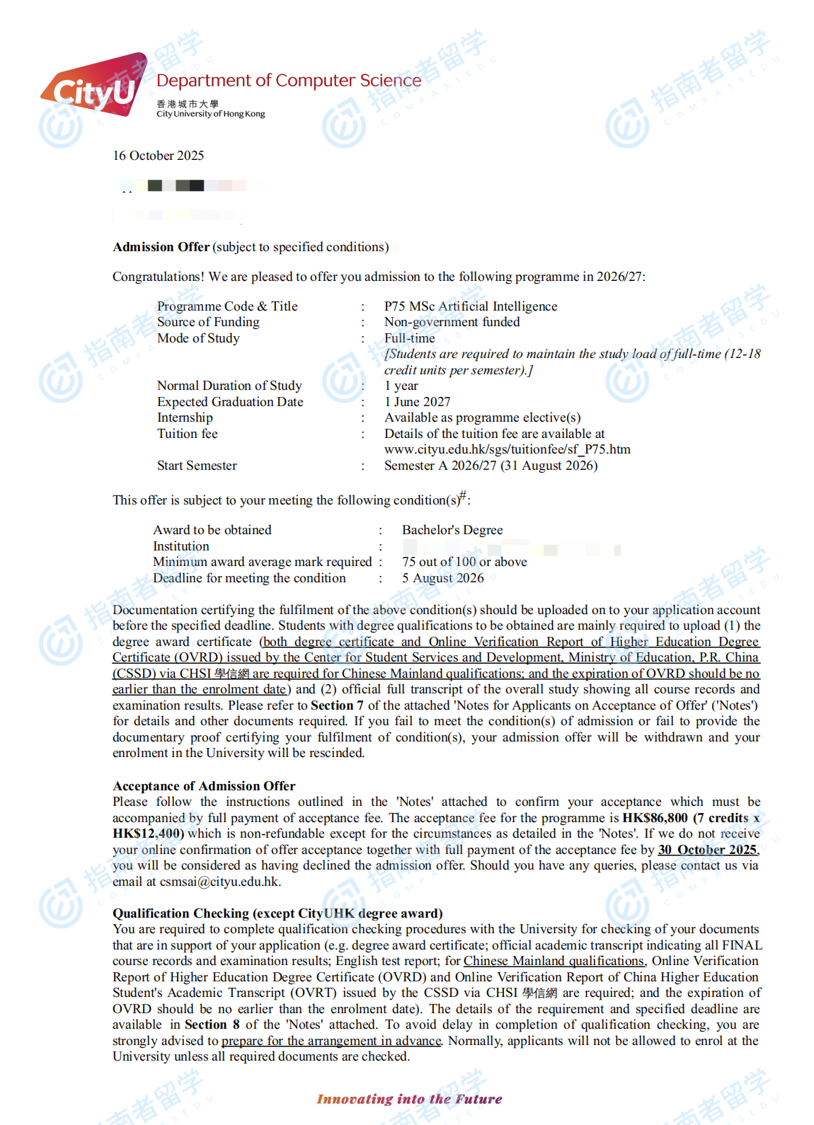 香港城市大学计算机科学理学硕士研究生offer一枚