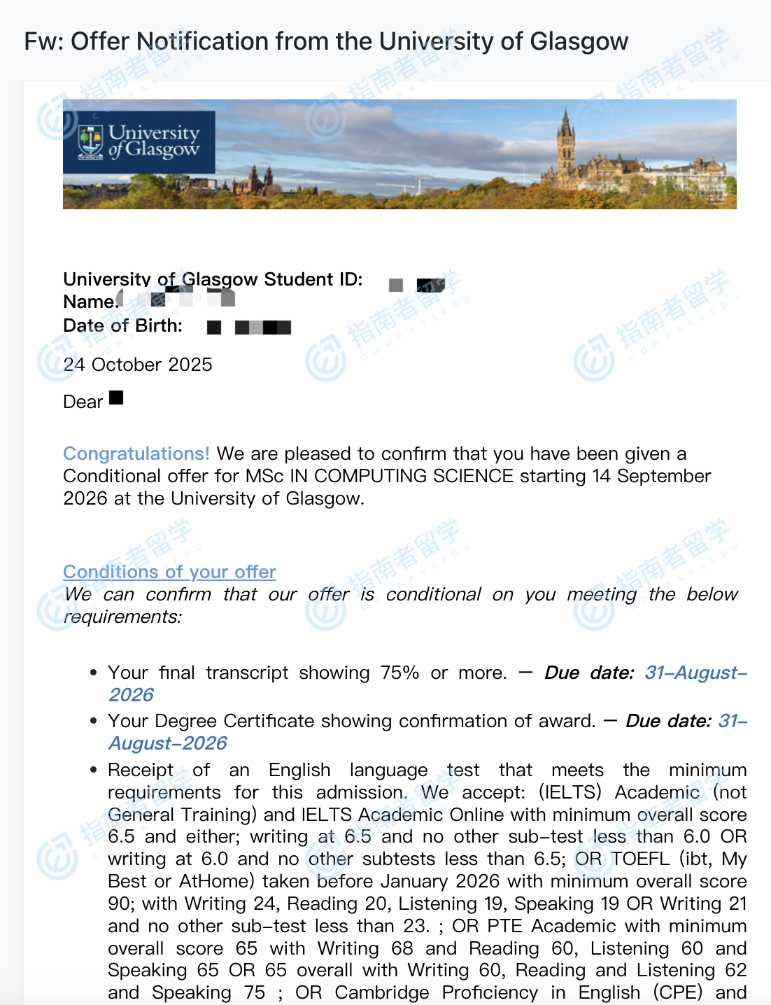 格拉斯哥大学计算科学理学硕士研究生offer一枚