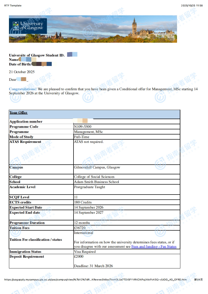 格拉斯哥大学管理学理学硕士研究生offer一枚