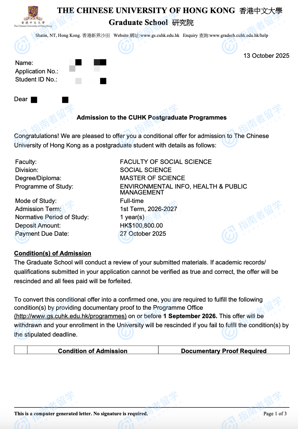 香港中文大学环境信息、健康与公共管理理学硕士研究生offer一枚