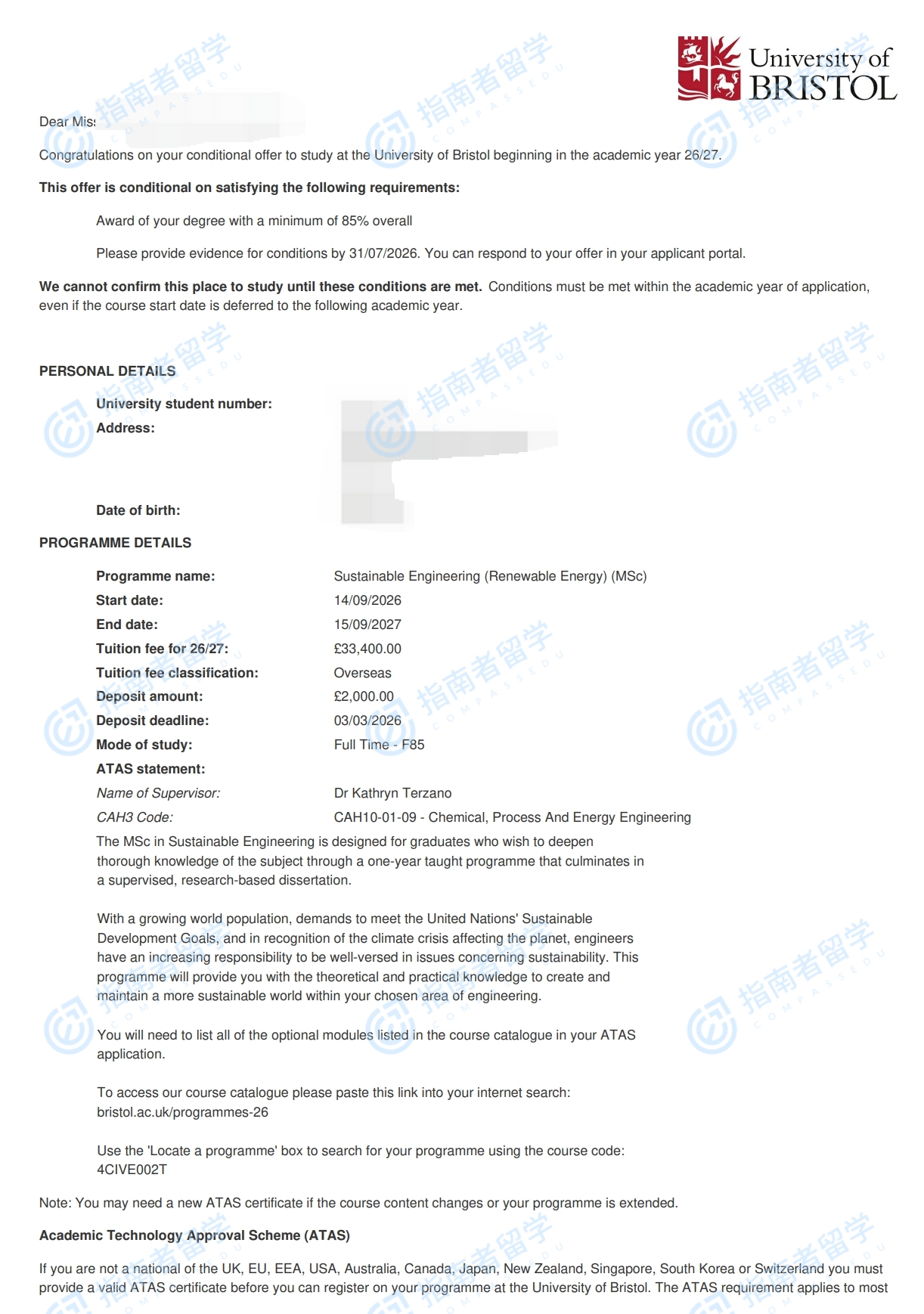 布里斯托大学可持续工程理学硕士(可再生能源)研究生offer一枚