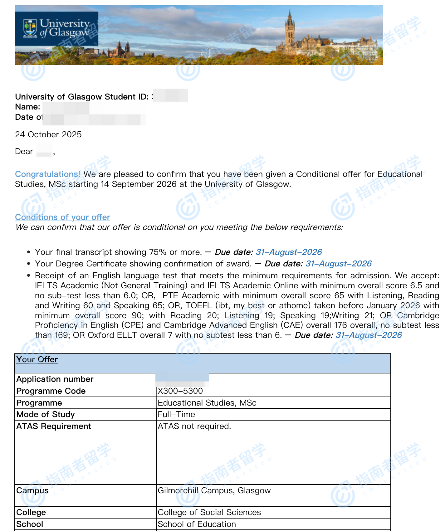 格拉斯哥大学教育学研究理学硕士研究生offer一枚