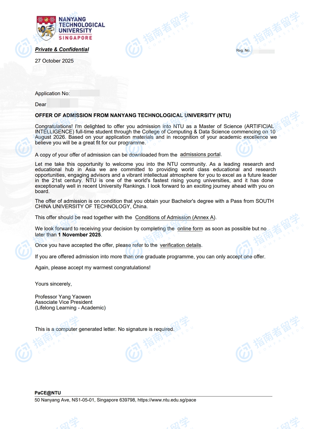 南洋理工大学人工智能理学硕士研究生offer一枚
