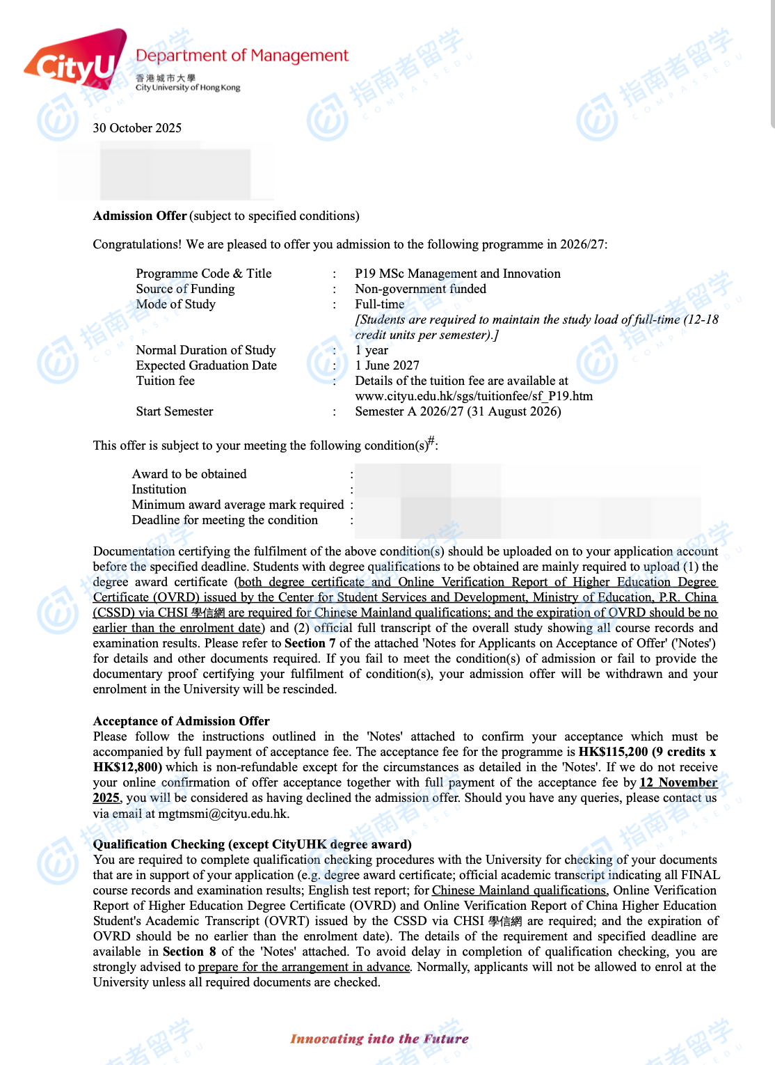 香港城市大学管理与创新理学硕士研究生offer一枚