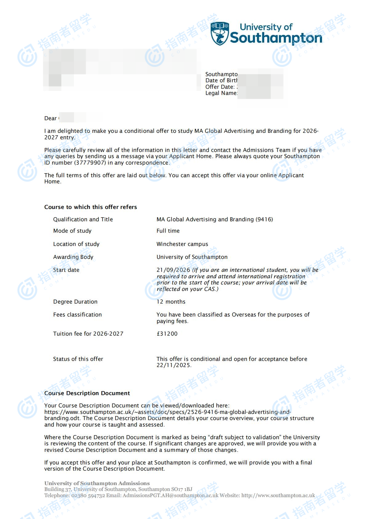 南安普顿大学全球广告学与品牌文学硕士研究生offer一枚