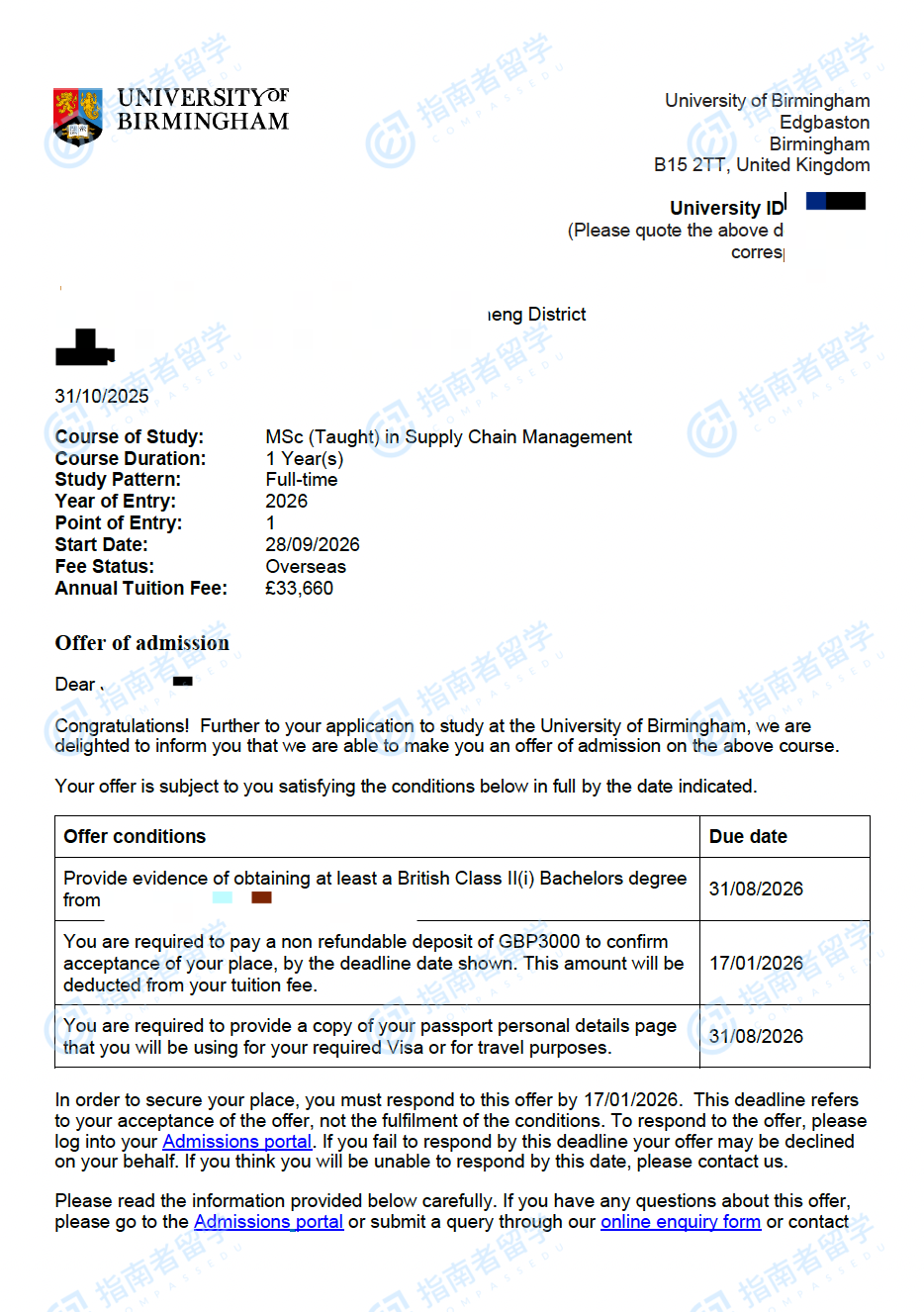 伯明翰大学供应链管理理学硕士研究生offer一枚