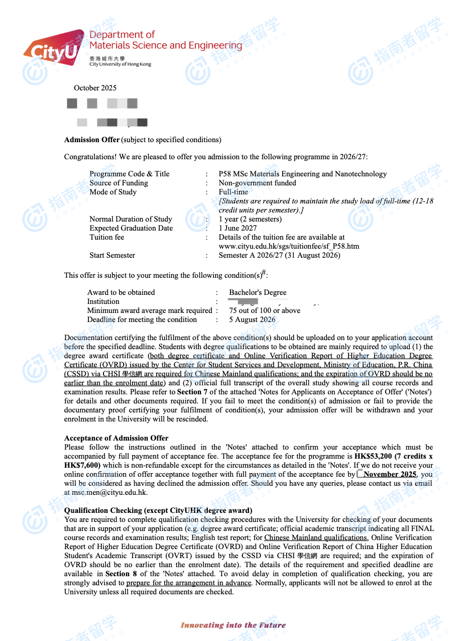 香港城市大学材料工程与纳米技术理学硕士研究生offer一枚