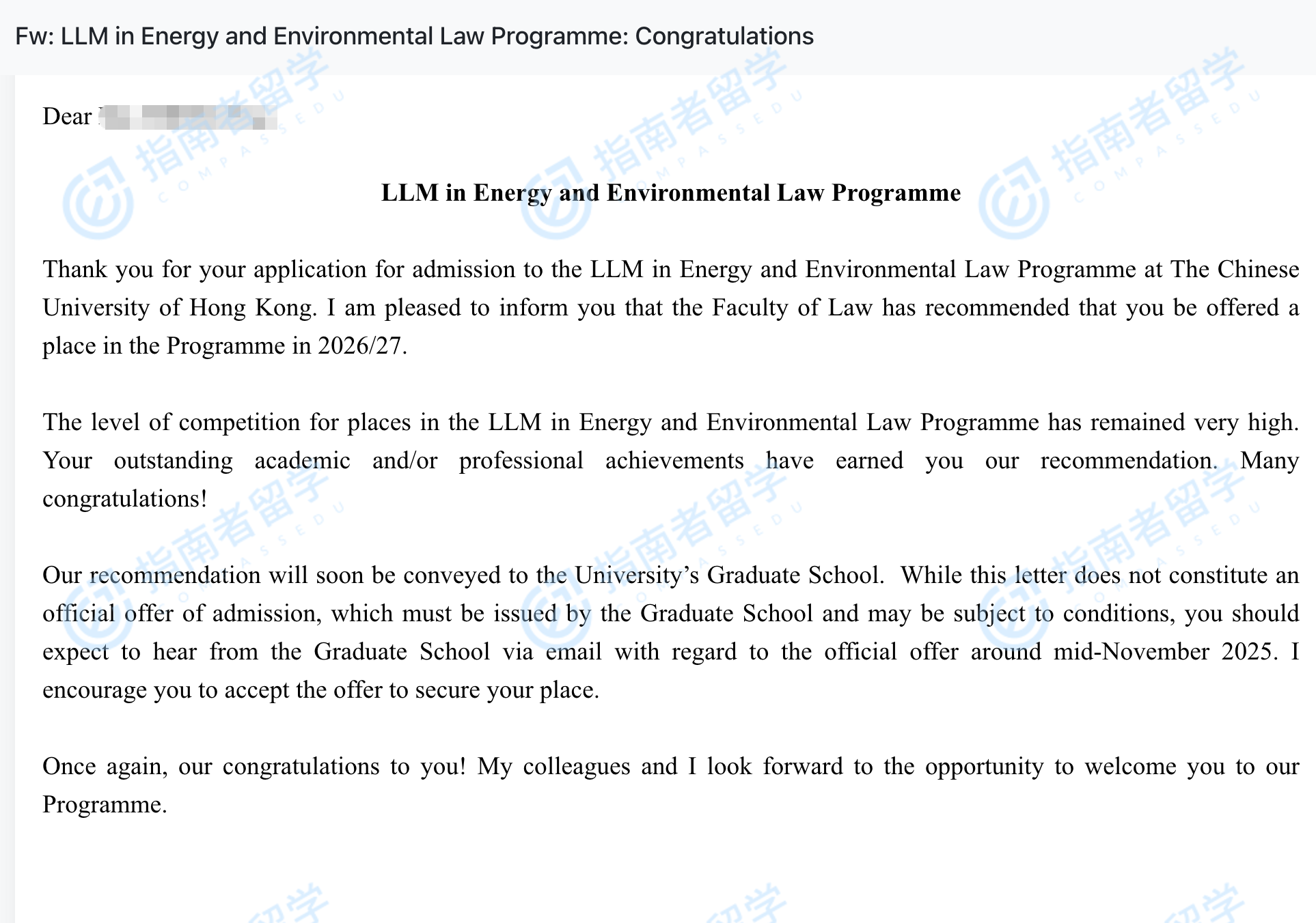 香港中文大学能源与环境法法学硕士研究生offer一枚