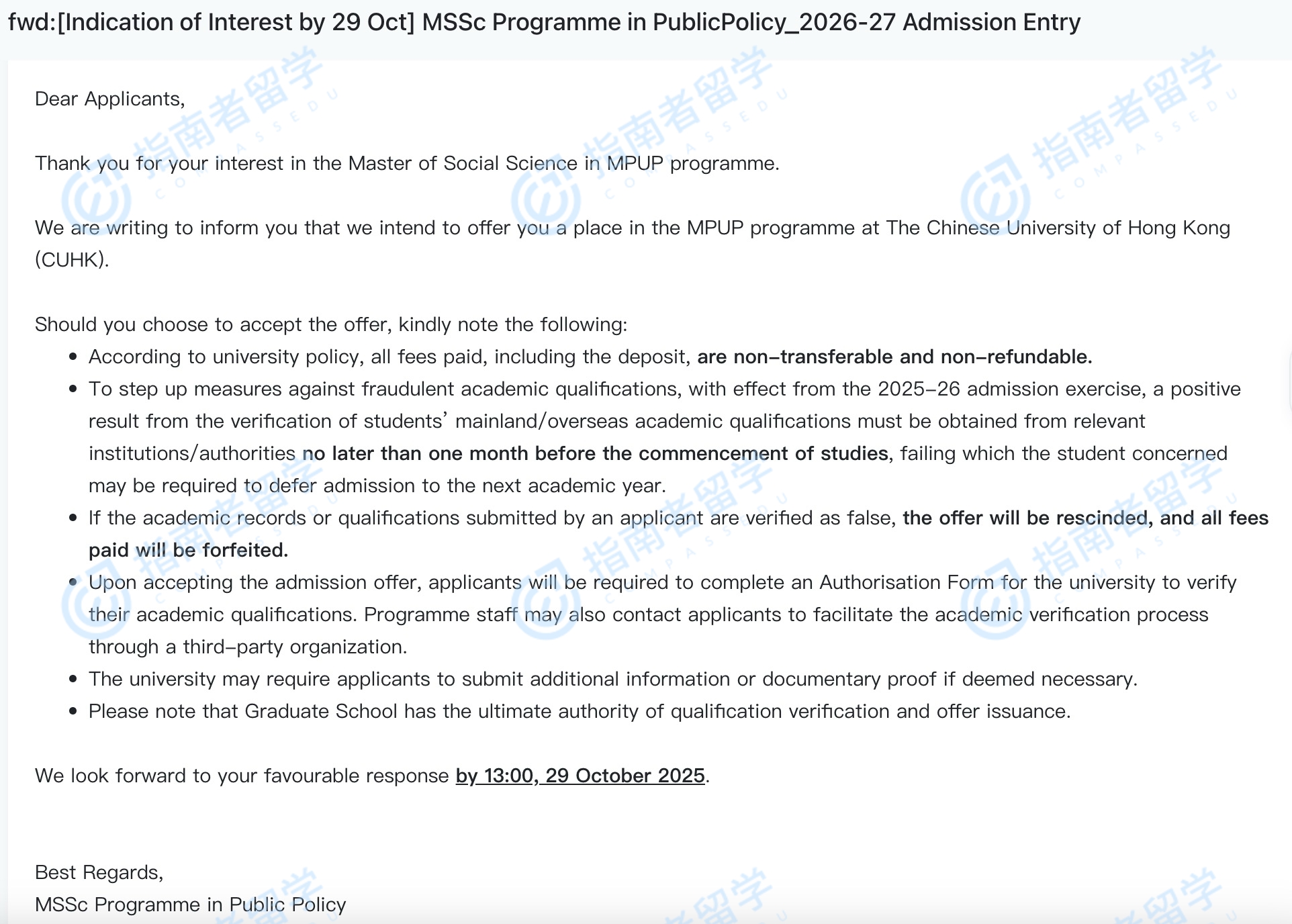 香港中文大学公共政策社会科学硕士研究生offer一枚
