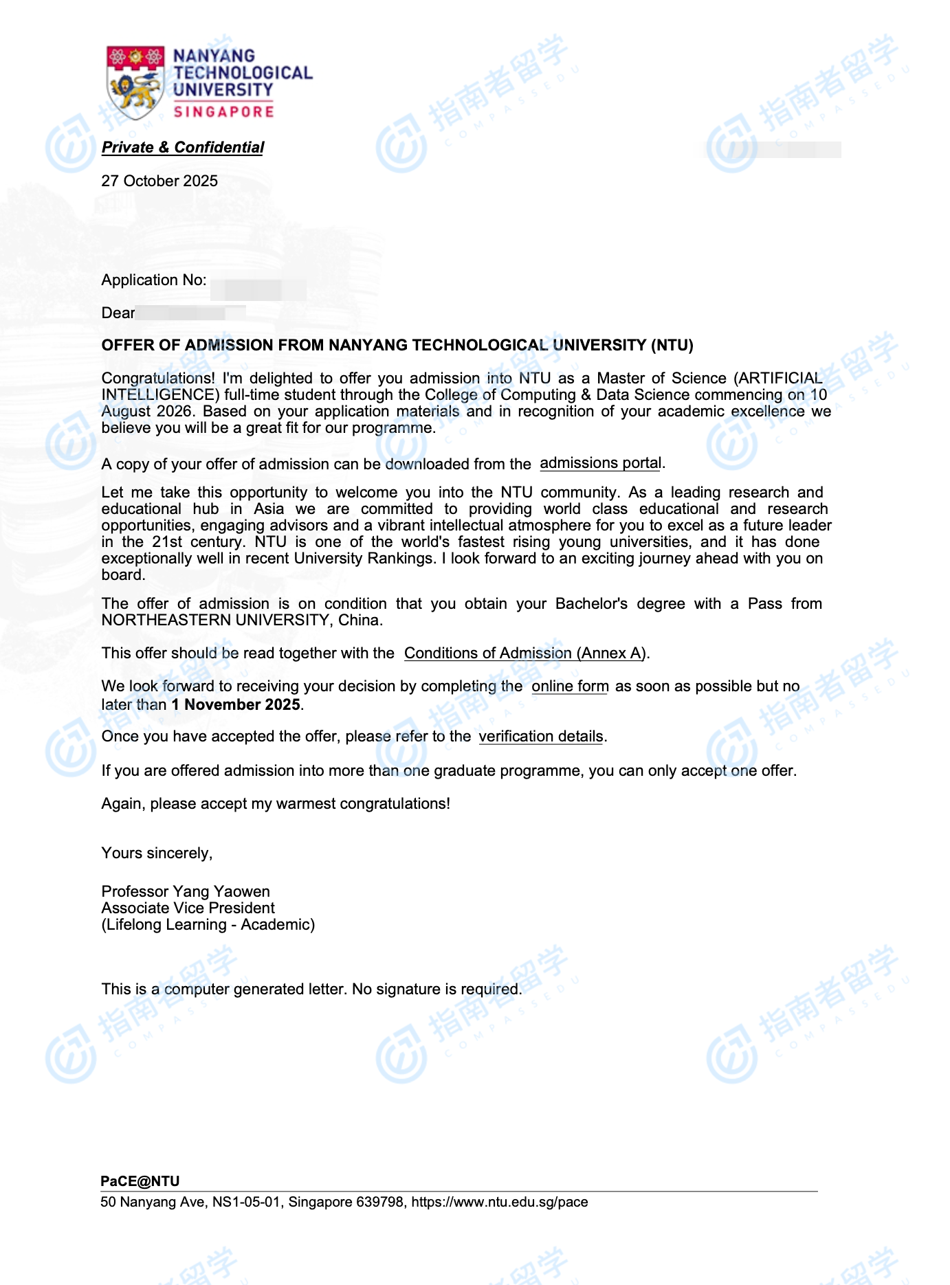 南洋理工大学人工智能理学硕士研究生offer一枚