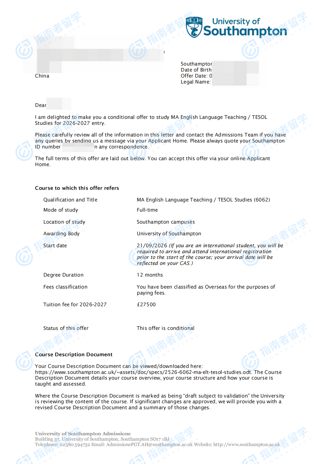南安普顿大学英语教育/对外英语教学研究文学硕士研究生offer一枚