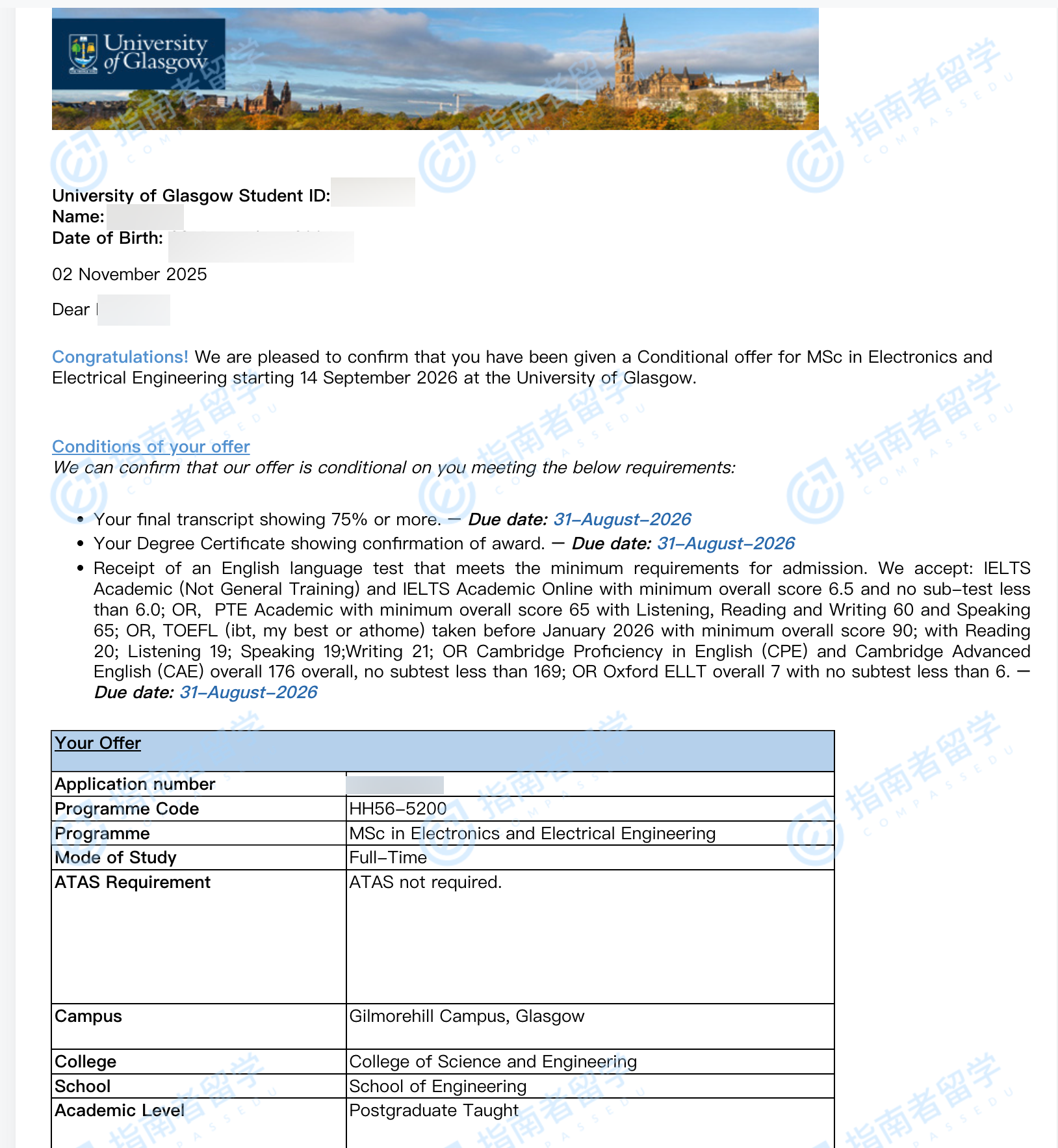 格拉斯哥大学电子与电气工程理学硕士研究生offer一枚