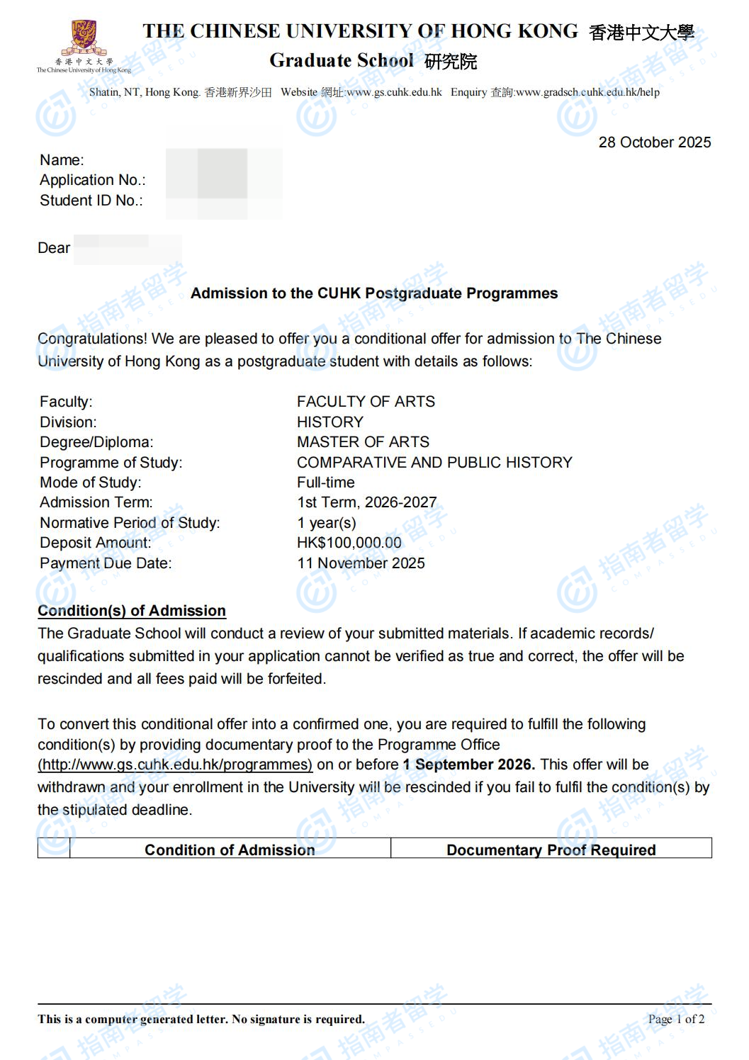 香港中文大学比较及公众历史学文学硕士研究生offer一枚
