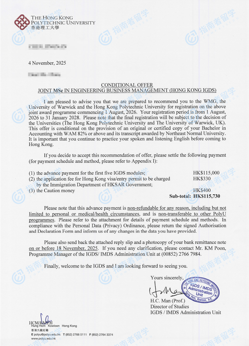 香港理工大学工程商业管理理学硕士研究生offer一枚