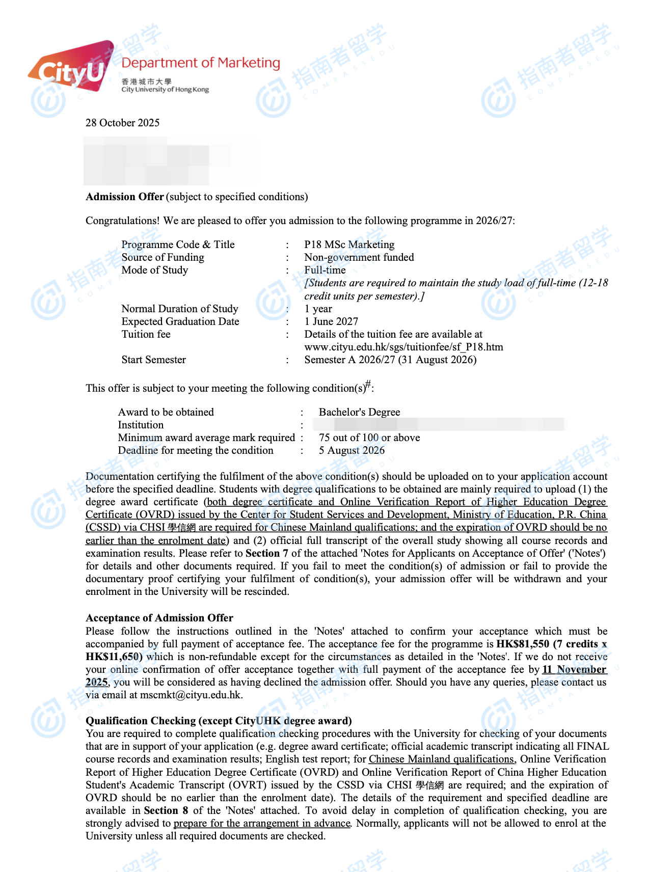 香港城市大学市场营销学理学硕士研究生offer一枚