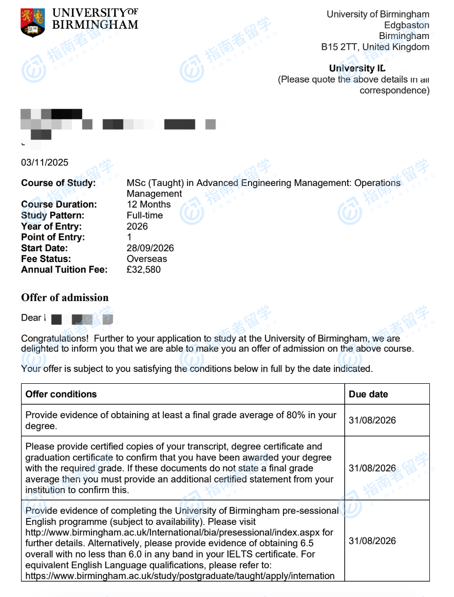 <p>在第一学期,学生将学习管理领域的核心概念。在第二学期,学生将在所设专业方向中四选一,进行精修。学生也有机会选择通识方向,根据自身要求选择课程。所有学生都要学习第一学期的模块,为进一步专业化管理学习打下坚实的知识与技术基础。伯明翰大学高级工程管理(运营管理)理学硕士项目的课程由伯明翰商学院(BBS)的顶尖学者提供,管理内容以研究为主导,利用BBS的专业知识和声誉,为学生提供高质量的学习体验。课程主题包括战略、创新、营销、组织行为和财务管理。在第二学期,学生将转向他们所选择的方向,在工程学院学者引导下探索实际管理应用,并借鉴其丰富的研究经验和产业链资源,使得自身在第一学期所学到的关键理念将得到延伸。这一新结构可确保学生在第一学期学习核心原理,在第二学期中应用这些原理,并有机会通过研究项目(60学分)来调查、开发当代工程管理的相关课题。</p>