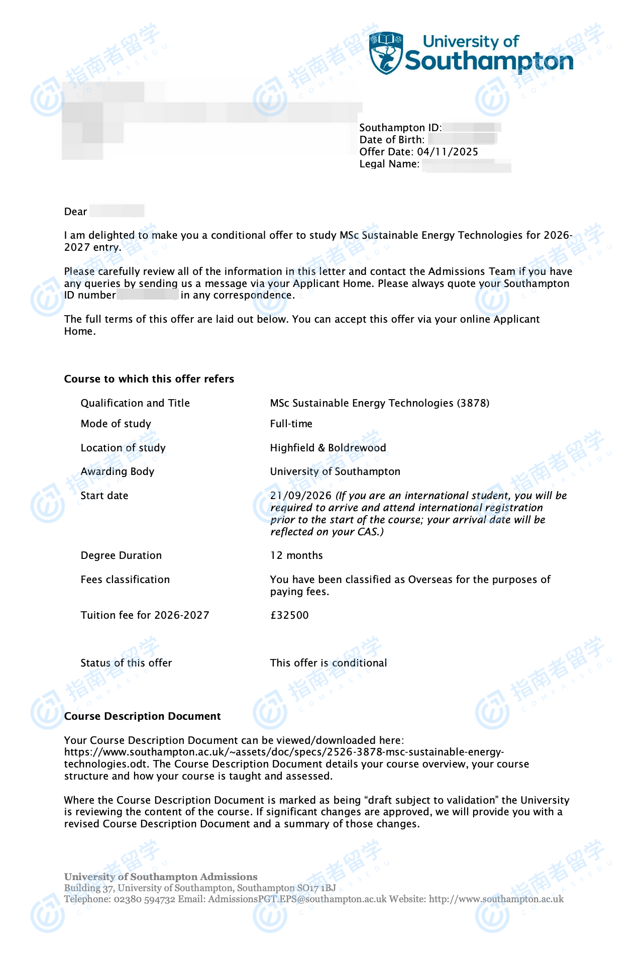 南安普顿大学可持续能源科技理学硕士研究生offer一枚