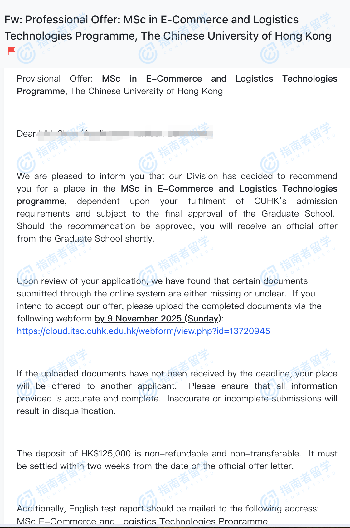 香港中文大学电子商务与物流技术理学硕士研究生offer一枚