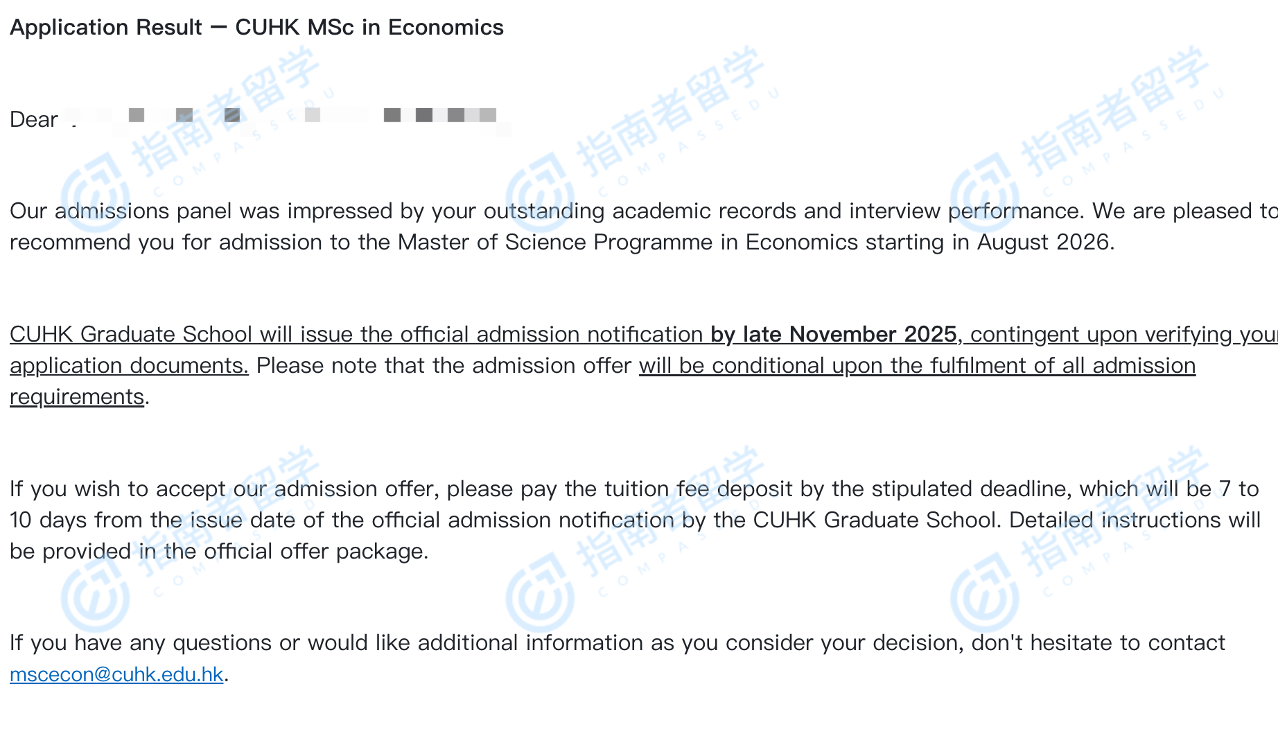 香港中文大学经济学理学硕士研究生offer一枚