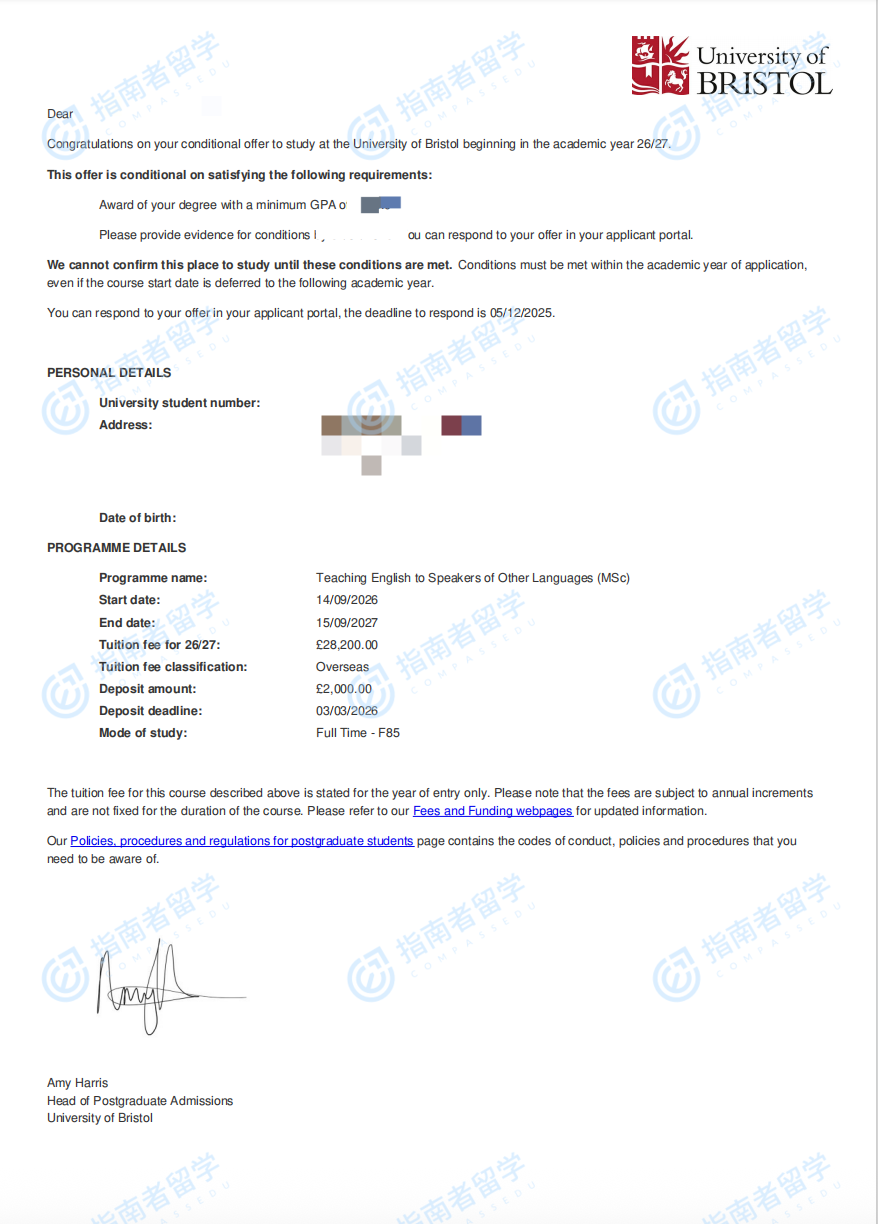 布里斯托大学对外英语教学理学硕士研究生offer一枚