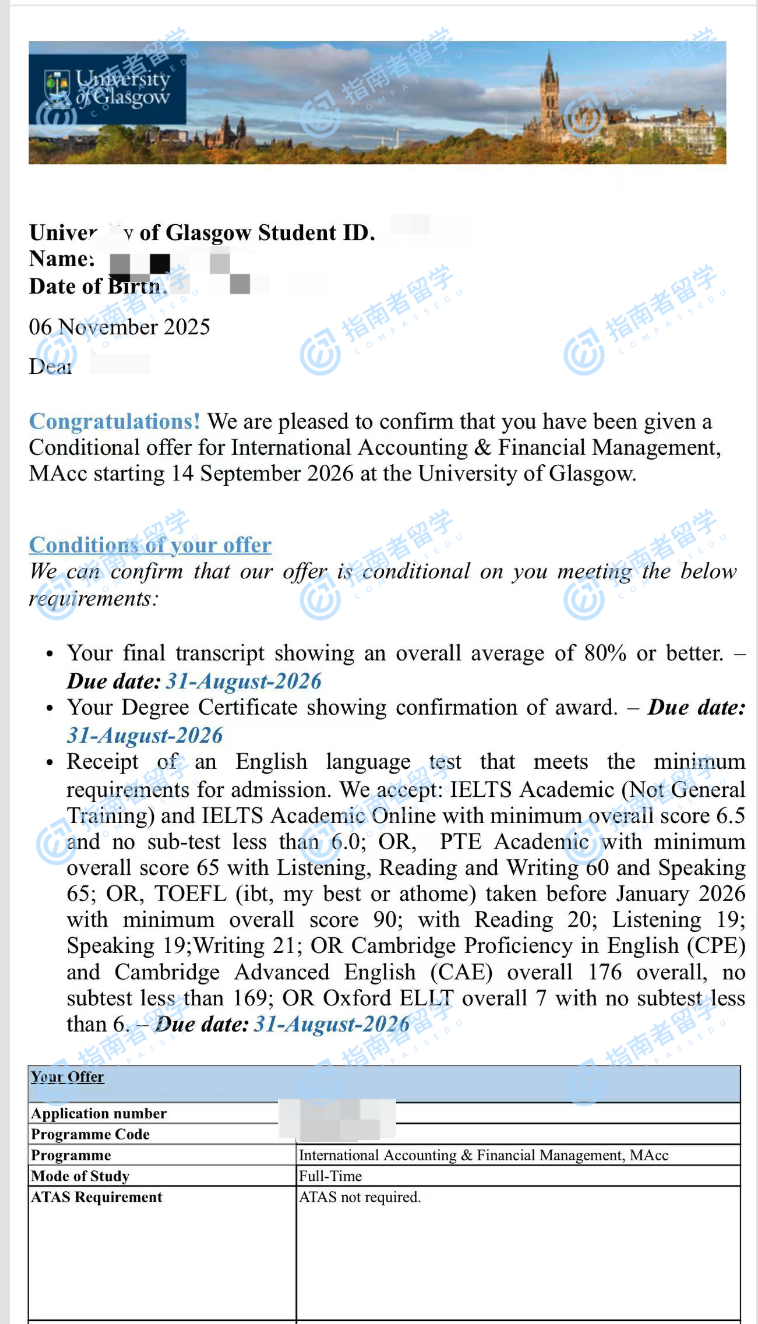 格拉斯哥大学国际会计与财务管理会计学硕士研究生offer一枚