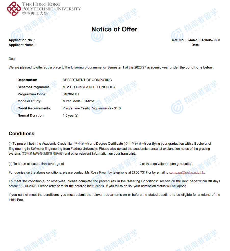 香港理工大学区块链科技理学硕士研究生offer一枚